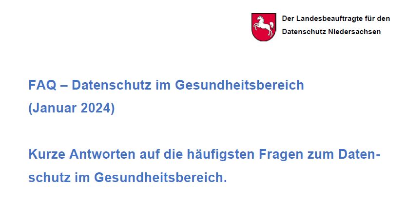 Der Landesbeauftragte für den Datenschutz Niedersachsen hat eine umfangreiche FAQ Liste zum Datenschutz im Gesundheitsbereich veröffentlicht.